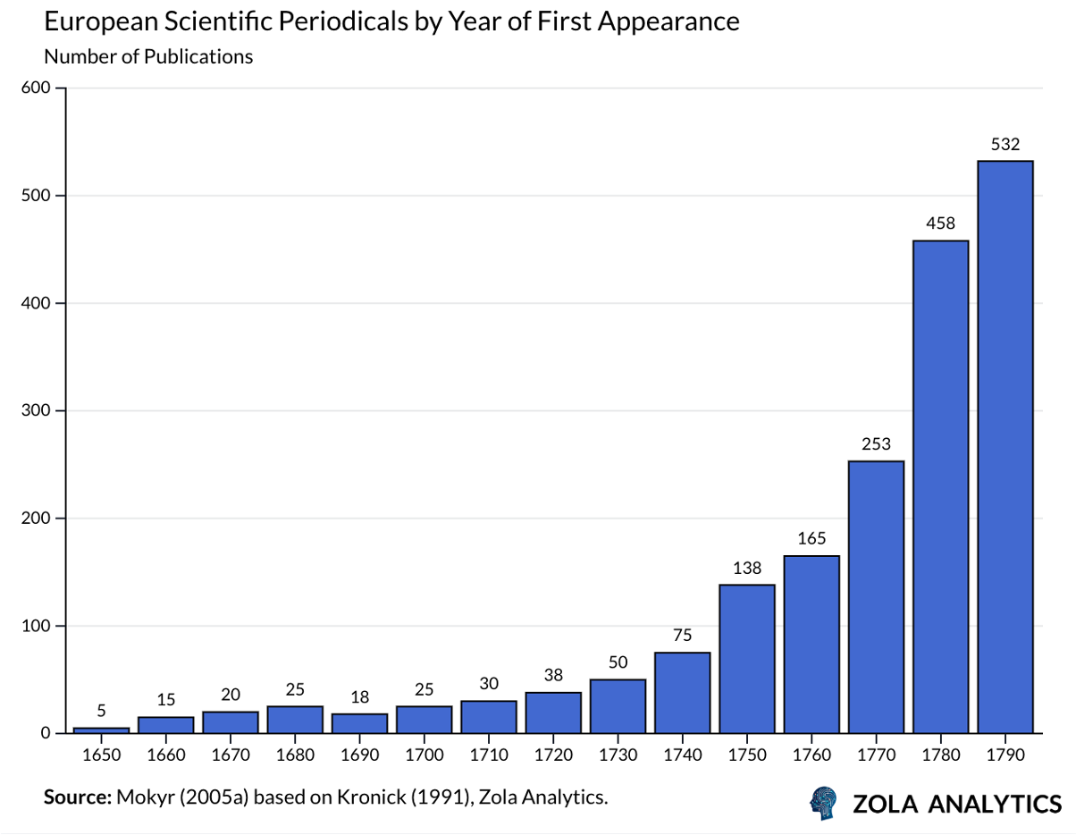 From the late seventeenth century, a new European culture of open inquiry began to connect scholars, inventors, and artisans. The spread of printing, correspondence, and learned societies created what Mokyr called the Republic of Letters, an open market for ideas in which evidence could be challenged and results reproduced. That intellectual infrastructure laid the ground for the most profound shift of the modern era: the durable accumulation of knowledge.